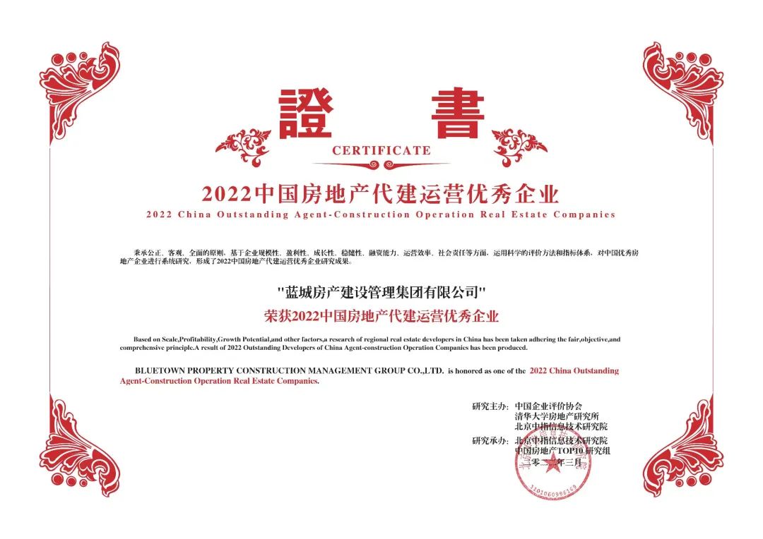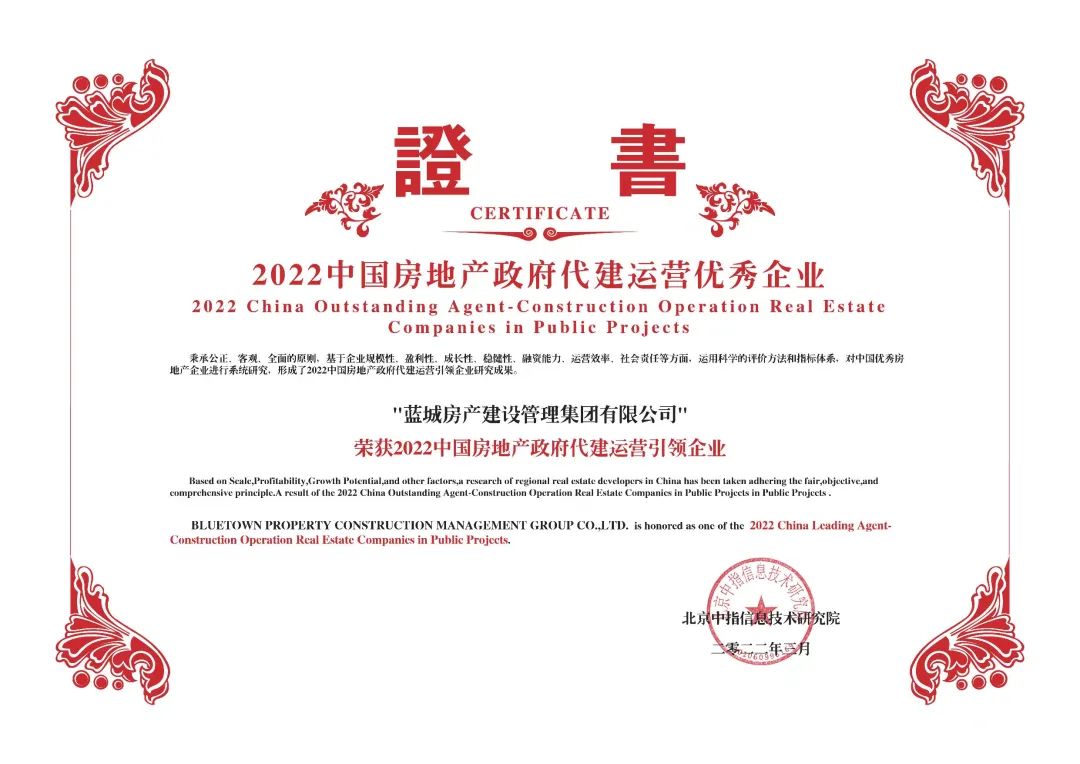 十余年铿锵之途,追寻理想的初心不变,“2022中国房地产代建运营优秀企业”和“2022中国房地产政府代建运营引领企业”两项大奖的授予,是社会各界对蓝城努力的肯定。未来,蓝城将继续以虔诚之心,行神圣之事,紧跟国家发展政策及社会需求,以自己的专业与优势,为人类谋福祉,为社会谋福利。